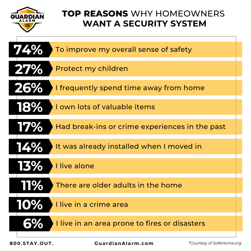 There are several key reasons why people protect their homes with security systems. For nearly three in four users in a study conducted by Safehome.org, the primary reason for their home security systems was to improve their overall sense of safety. They found that users’ sense of safety increased with the number of components that people used. Cameras and video doorbells, motion sensors, and burglar alarm systems all created an equal sense of increased security among users.